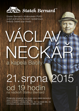Statek Bernard Vás zve na výjimečné vystoupení nestárnoucí hvězdy české pop music! Václav Neckář dokázal v posledních letech neuvěřitelným způsobem navázat na svou zářivou kariéru a vydat dvě skvělá alba. Muzikant, který oslovuje posluchače napříč generacemi, koncertuje s kapelou Bacily na Statku Bernard v pátek 21. 8. 2015 od 19 hodin.