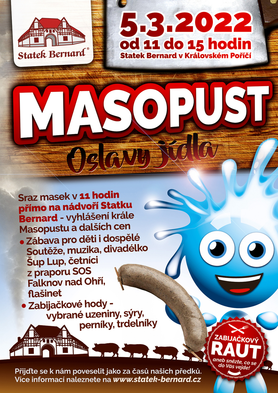 V 11 hodin se sejdou masky přímo na nádvoří Statku Bernard. Bude se nabízet drobné občerstvení, zvolíme krále Masopustu a oceníme nejnápaditější masky! Zúčastněte se také Vy! Přijďte v kostýmu, užijte si pravý venkovský karneval!