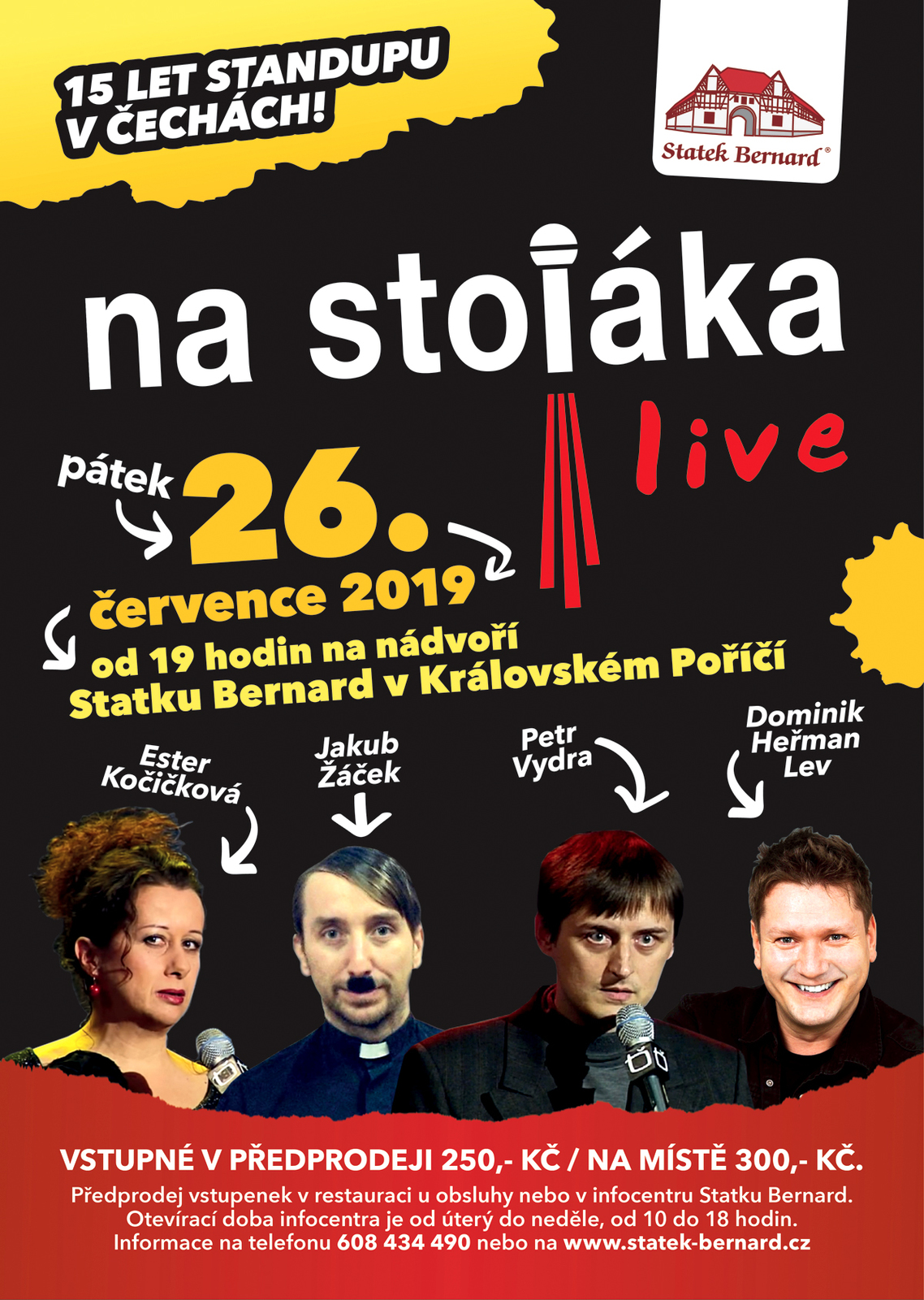 15 let standupu v Čechách s námi na Statku Bernard oslaví skupinka kolem improvizační show Na stojáka - pátek 26. července 2019 od 19 hodin. Diváky tentokrát přijede rozesmát Ester Kočičková, Jakub Žáček, Petr Vydra a Dominik Heřman Lev.