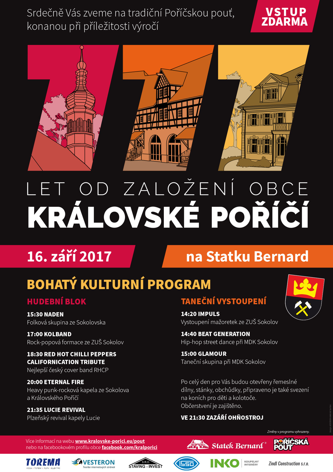 Přijďte se bavit na tradiční venkovskou pouť! V sobotu 16. 9. 2017 na Statku Bernard - Poříčská pouť 2017 aneb oslavme společně 777 let od založení obce Královské Poříčí.