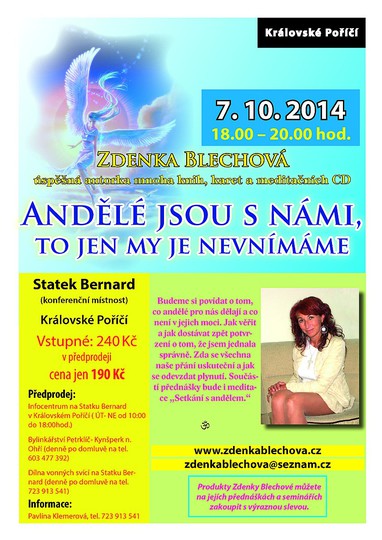 Na Statku Bernard proběhne přednáška úspěšné autorky knih Zdenky Blechové pod názvem "Andělé jsou s námi, to jen my je nevnímáme". Přednáška se uskuteční 7.10. 2014 od 18 do 20 hod. Vstupné v předprodeji je 190,-