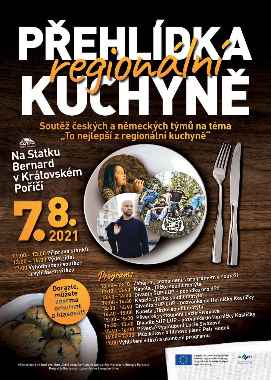 Statek Bernard v Královském Poříčí vás zve dne 7.8.2021 od 13 do 17 hod. na přehlídku regionální kuchyně! Ochutnávejte zdarma pochoutky soutěžících a staňte se na chvíli porotcem, odborníkem v gastronomii! Nenechte si ujít skvělý kulturní program. Tančit budeme s kapelou "Těžko soudit motýla", zpívat anglické filmové hity s Lucií Sivákovou, je připravena i pohádka pro děti Divadélka ŠUP LUP a na závěr se společně ponoříme do hlubin hlasu Petra Hodka a jeho muzikálových písní ...