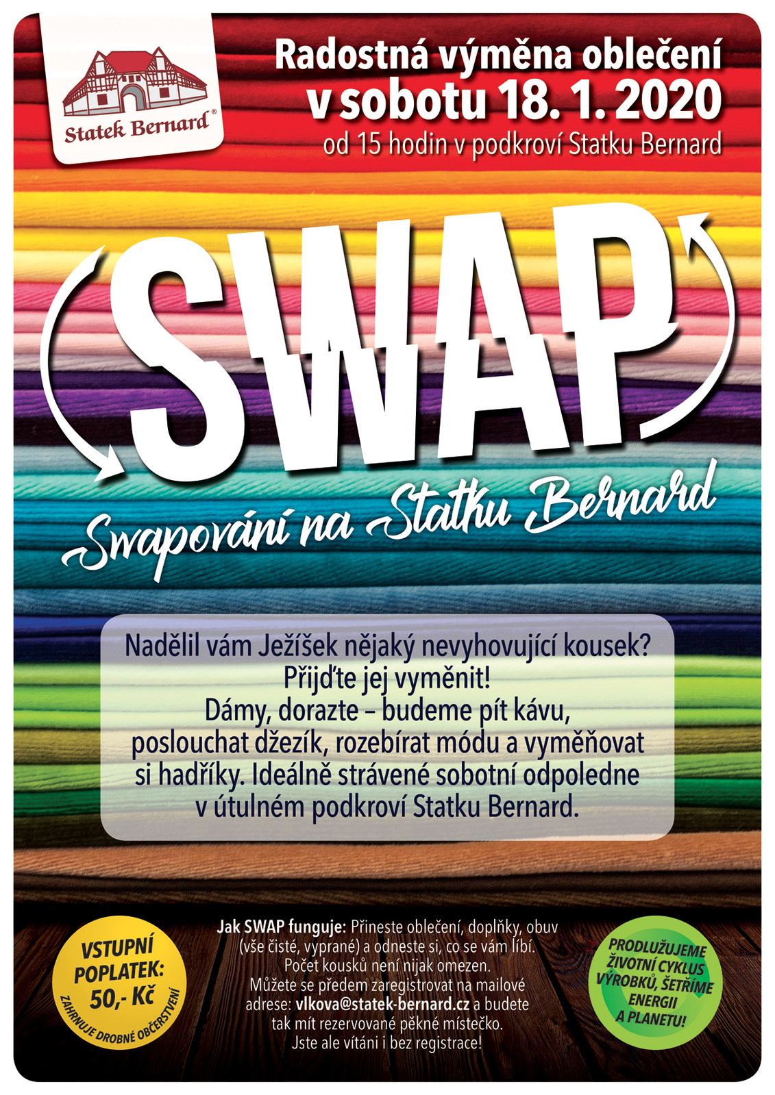 Jak SWAP funguje: přineste oblečení, doplňky, obuv a odneste si, co se Vám líbí. Předem se zaregistrujte na mailové adrese: vlkova@statek-bernard.cz. Jste vítané i bez registrace.