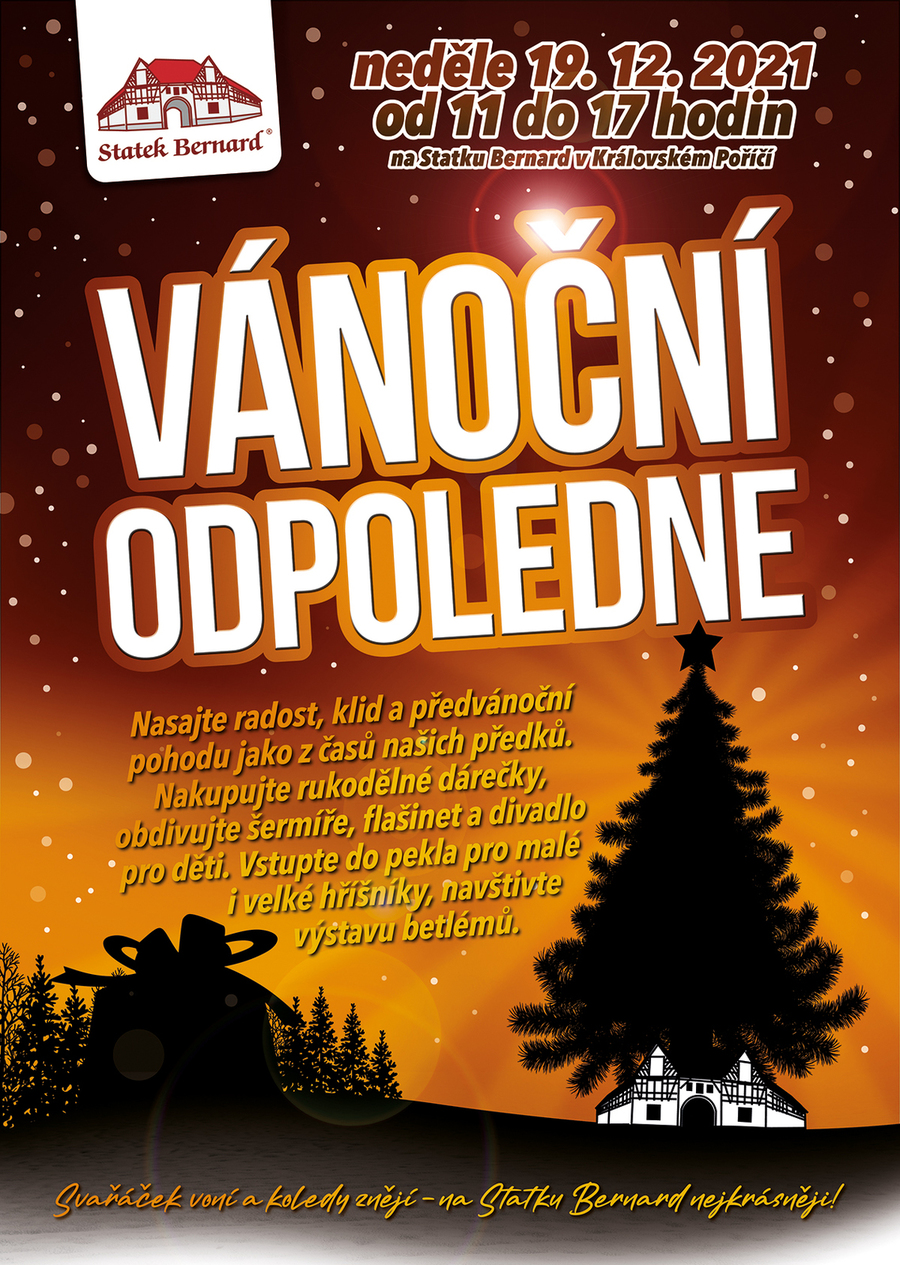 Přijměte pozvání na Statek Bernard - nádvořím se rozvoní vánoční svařák, budou se zdobit perníčky, zpívat koledy a vystavovat betlémy. Dětem rozzáříme oči divadélkem. Do starých časů nás přenese flašinetářka Eva a skupina historického šermu Mortis. Bát se budete v našem Pekle!!! A při tom všem si nakoupíte poctivé rukodělné dárečky pro své blízké. Těšíme se na vás poslední adventní neděli 19. 12. 2021 od 11 do 17 hod. hodin.