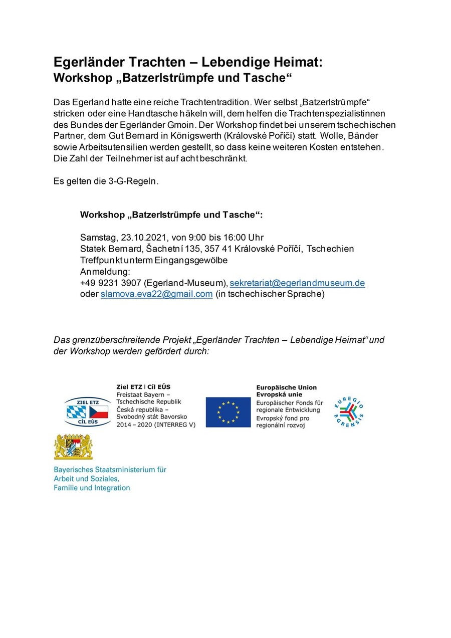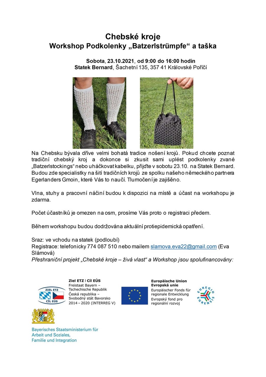 Na Chebsku bývala dříve velmi bohatá tradice nošení krojů. Pokud chcete poznat tradiční chebský kroj a dokonce si zkusit sami uplést podkolenky zvané „Batzerlstockings“ nebo uháčkovat kabelku, přijďte v sobotu 23.10. na Statek Bernard. Budou zde specialistky na šití tradičních krojů ze spolku našeho německého partnera Egerlanders Gmoin, které Vás to naučí. Tlumočení je zajišěno.