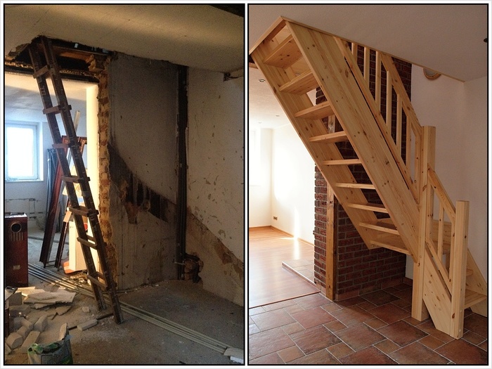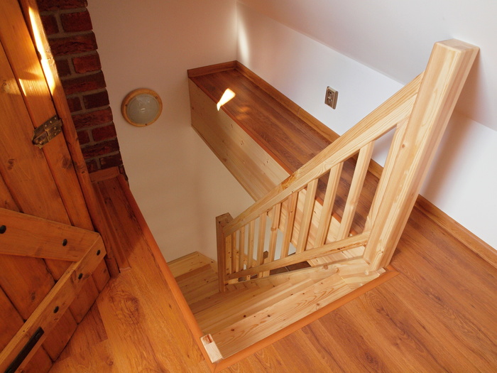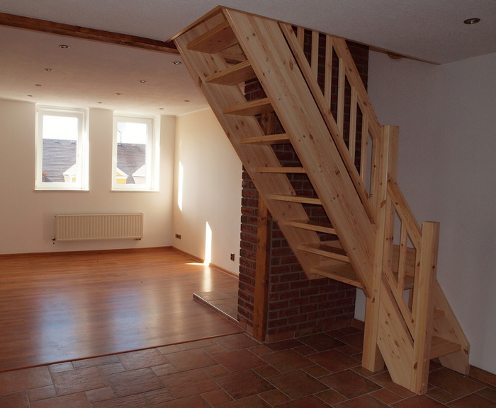 Dřevěné schody z masivní borovice jsou lakované transparetním lakem. Zhotovené pro mezonetový byt v Karlových Varech.