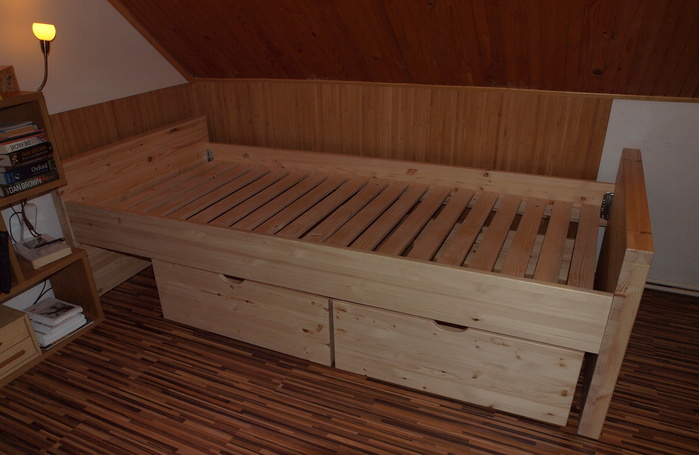 Masivní smrková postel vyrobená na zakázku do Merklína. Byl zde kladen požadavek na zvláštní rozměry postele 220 cm x 100 cm. Pod postelí jsou dva pojízdné šuplíky na knihy.